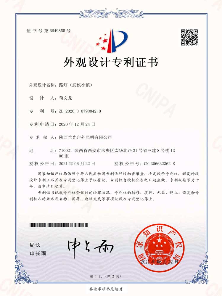 簡介—— 設計名稱:武俠小鎮景觀燈 設計用途:園林、景觀照明 專利種類:外觀設計 專利號:ZL 2020 3 0798042.0